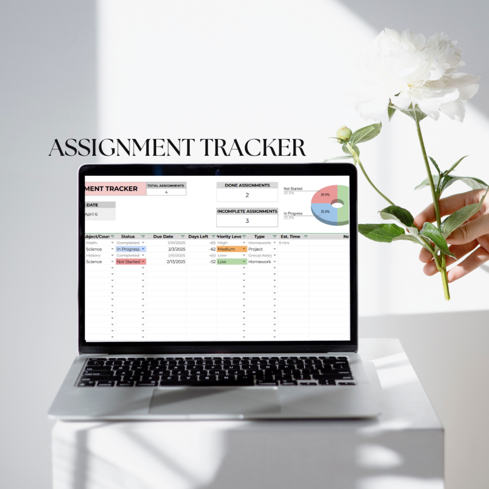 Our Assignment Tracker is a streamlined, easy-to-use tool designed to help students manage their coursework with clarity and confidence. Whether you're juggling multiple classes, projects, or due dates, this tracker keeps everything in one place so nothing slips through the cracks.